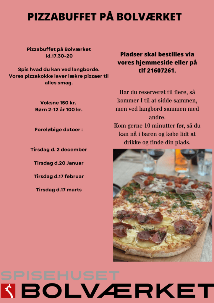 Hele året har vi jævnligt pizzabuffet, pizzakurser for børn, musik- og danse arrangementer og pop-ups med forskellige gæstekokke. Vi har mange flere spændende tiltag i støbeskeen, så følg endelig med her og på Facebook